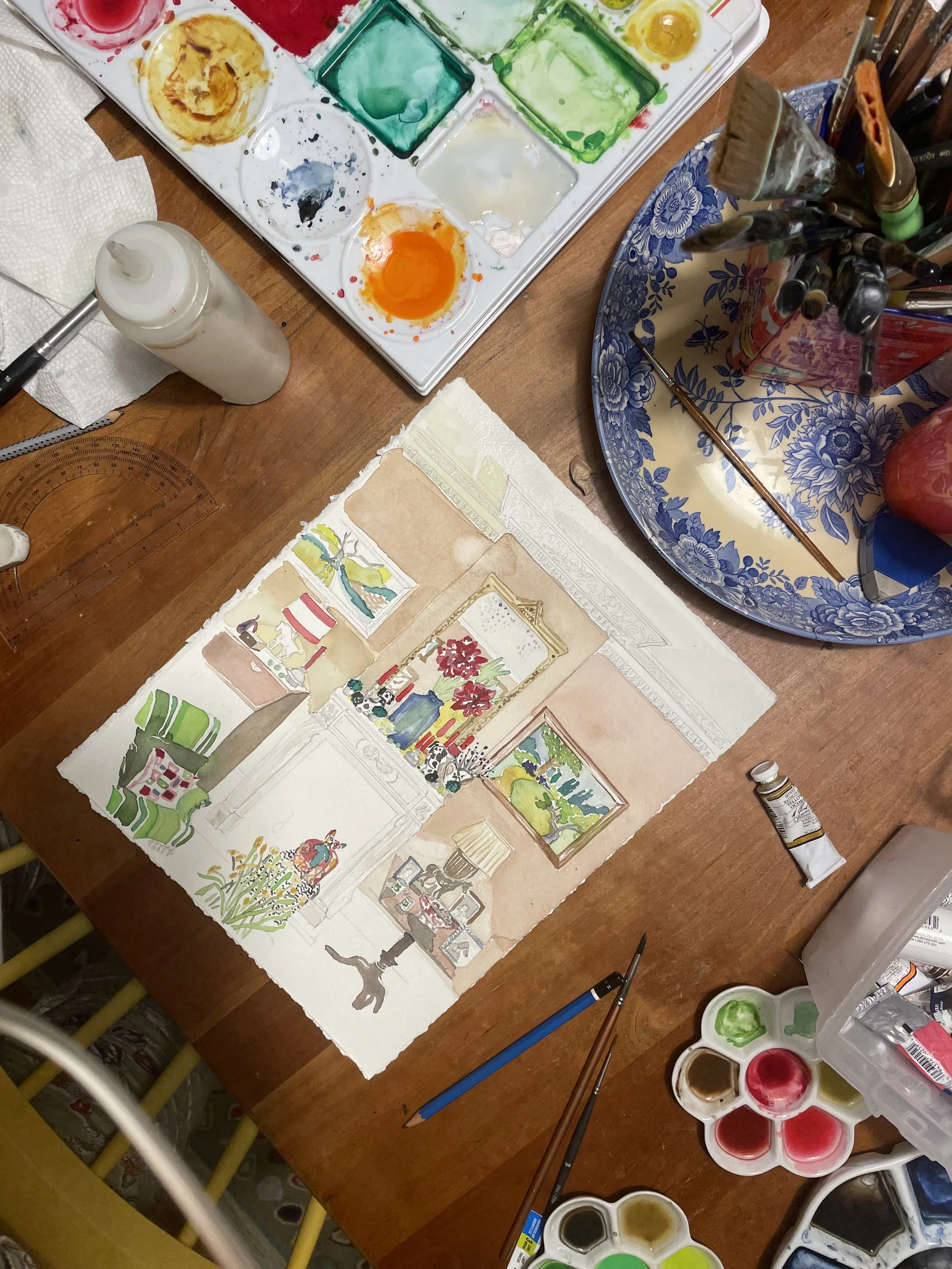 She especially loves using watercolor to memorialize rooms where special moments have taken place, where good friends live, and where one can simply relax.